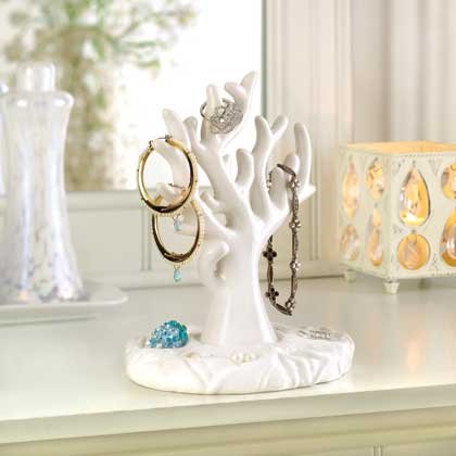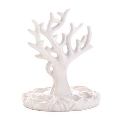 Display your glittering baubles upon a jewelry holder thates a treasure all its own. This sculptural piece of art is fashioned after an undersea coral branch and finished in white for a clean, modern look. It presents endless possibilities for hanging bracelets, rings, and necklaces, and the base has nooks to nestle stud earrings and more! Velvet lining on bottom.