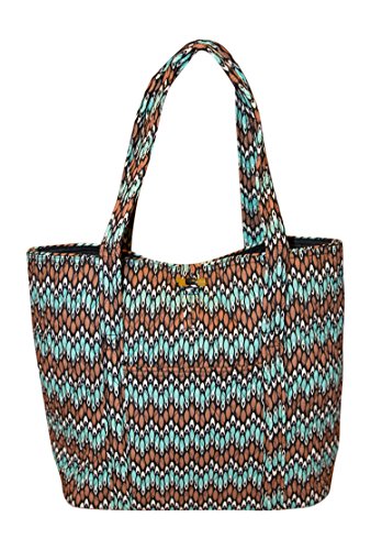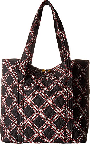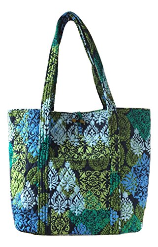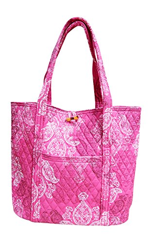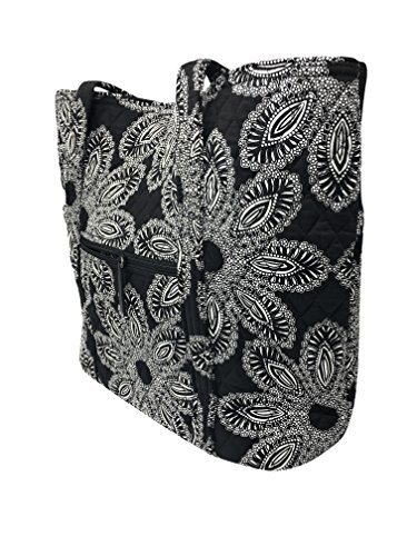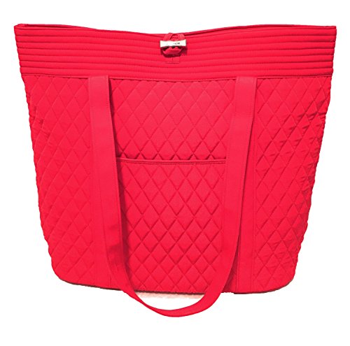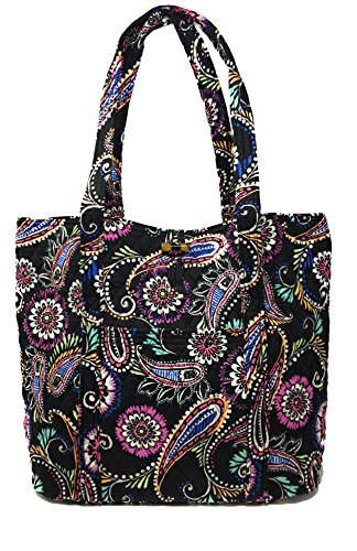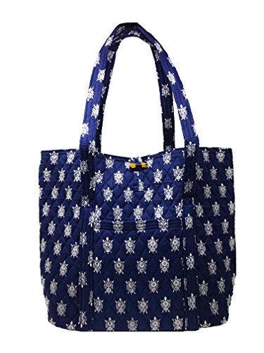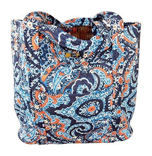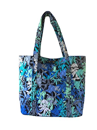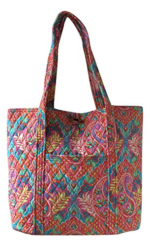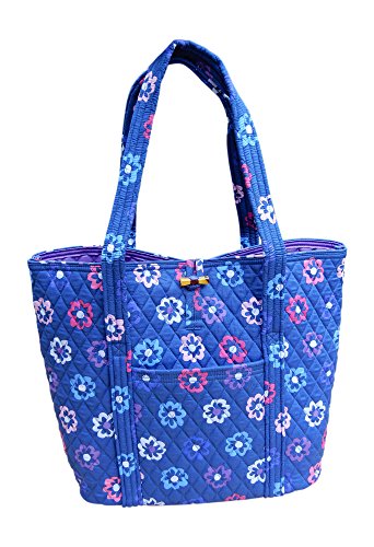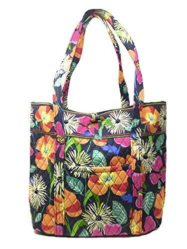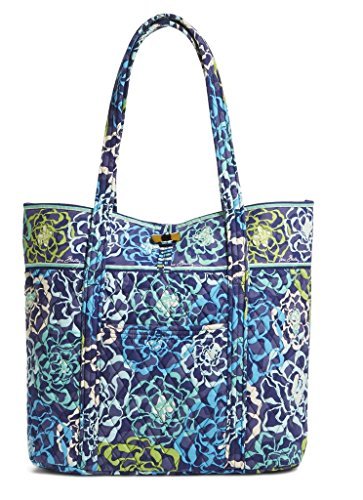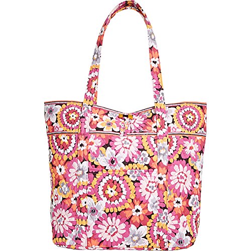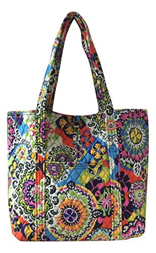 Vera's durable and spacious Vera tote is made of soft quilted fabric with a removable sturdy fabric covered bottom insert. The open top features a loop and tortoise toggle closure and the interior featuring 6 roomy open slip pockets. There is an open slip pocket on the front, and a zippered pocket on the back. The dual straps have a comfortable drop of about 11 inches and are sewn from the bottom, all the way up each side. The Vera Tote is versatile and makes for a great, every day tote - whether for school, work, the beach, or the gym. It makes a great carry-on bag for travel, or even a beach bag. It is lightweight, and easily maintained. Just remove the sturdy fabric covered insert and it can be placed in the wash. It measures 14 inches long at the bottom and tapers to 17 inches long at the top x 14 inches high x 6 inches wide. Machine wash cold, gentle cycle, only non-chlorine bleach as needed, line dry. Patterns with solid color interiors are designed for Vera Bradley Outlets.Feature