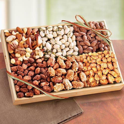 -. Binding : Grocery -. Brand : Golden State Fruit -. EAN : 0819354010067 -. Feature : A festive nut mix with half savory nuts and half sweet nuts / Lots of premium savory nuts: pistachios in the shell, roasted salted mixed nuts and smokehouse almonds / Lots more sweet nuts: cinnamon toffee almonds, butter toffee pecans and butter toffee peanuts / Presented in a wooden tray with carved handles and tied with a raffia bow / Ships in Certified Frustration-Free Packaging -. Label : Golden State Fruit -. Manufacturer : Golden State Fruit -. MPN : AP8014 -. NumberOfItems : 1 -. PackageQuantity : 1 -. PartNumber : AP8014 -. ProductGroup : Grocery -. ProductTypeName : GROCERY -. PublicationDate : 2012-09-08 -. Publisher : Golden State Fruit -. Size : 30 oz -. Studio : Golden State Fruit -. Title : Golden State Fruit Savory and Sweet Deluxe Nut Gift Tray -. UPC : 819354010067
