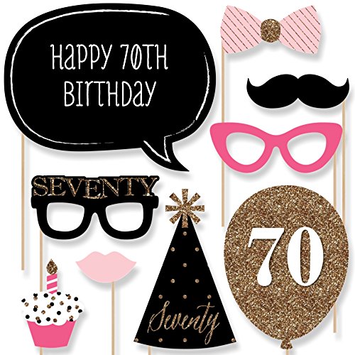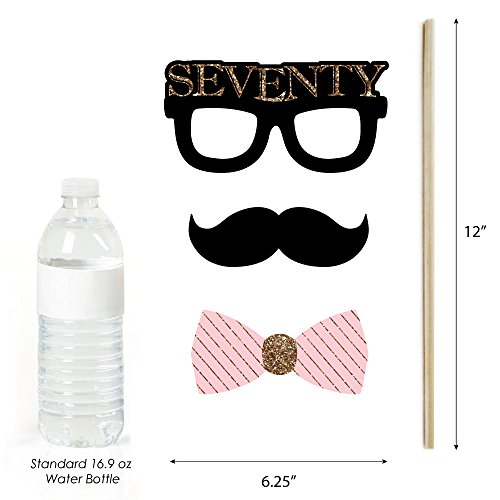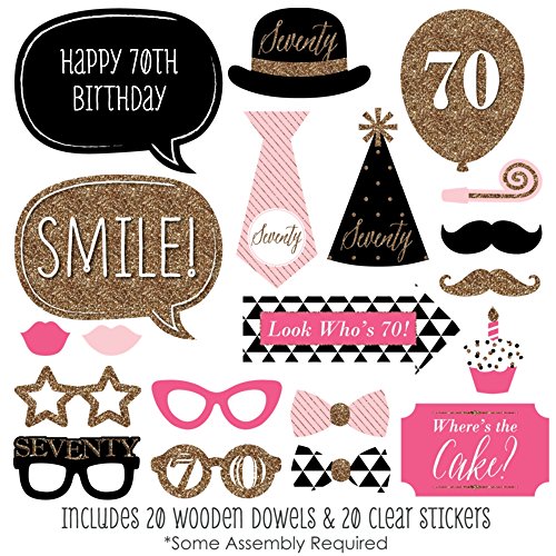 20-Piece Pink, Black and Gold Photo Booth Props Kit INCLUDES 20 Chic 70th Birthday photo booth props, 20 wooden dowel sticks and adhesives for assembly. EASY ASSEMBLY: Simply attach the printed DIY photo booth props to the wooden dowels with included adhesive and reinforcing stickers.
