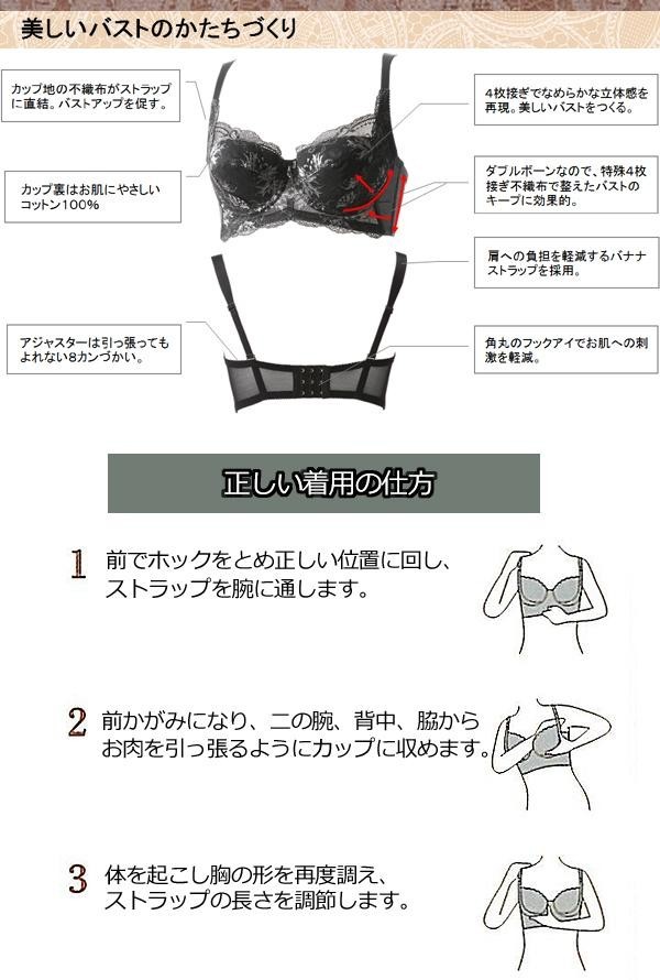 | ●補正下着が初めてという方でも楽々フィッティング。着用時は勿論、脱いだ後の体も美しくする為の矯正下着。 | | ●補正下着のホールド力と肌着のような優しさ。長時間でも着用できる着心地の良さを追求しました。 | | ●段差や黒ずみの原因のゴムはできるだけ排除。お肌に優しい素材にこだわりました。 | | ●カップ裏はお肌に優しいコットン100%。4枚接ぎで滑らかな立体感を再現しました。 | | ●肩への負担を軽減するバナナストラップを採用。食い込みにくい優しいストラップです。 |