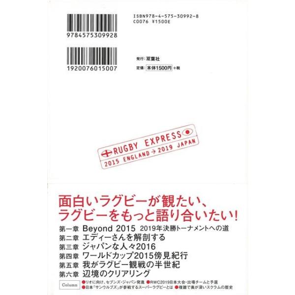 【商品説明】 定価(税込み):1,620円 値引き:10% OFF 日本ラグビー凱歌の先へ--2019年W杯日本大会へのカウントダウン、ジャパンウェイ第2幕が始まる! 2015年イングランド大会でW杯史上最大の衝撃と称された南アフリカ戦の勝利、日本中を熱狂させた歴史的3勝。その先に見えてきた日本ラグビー界の課題とは? 初心者からオールドファンまで、ラグビー観戦がもっと楽しくなる取材記事&薀蓄コラム満載!! 知れば知るほど、ラグビーは深くて面白い! バーゲンブック 新品 特価 格安 スポーツ アウトドア 球技 パン 歌 歴史 初心者 日本 | |