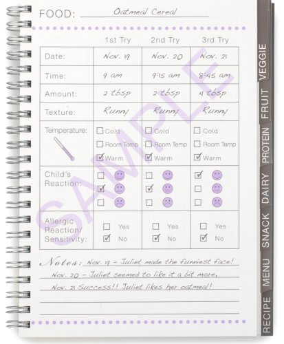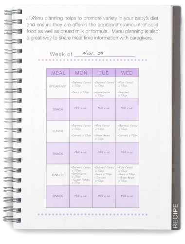 -. Feature : 5.5"x7.5" Journal - fits in diaper bag or purse / Logging sections divided by Grain, Veggie, Fruit, Protein, Dairy and Snack and includes a sample page for sested use / Weekly menu planner (12 weeks) to help promote variety in child's diet and for sharing mealtime information with caregivers / Favourite recipes section / Allergy/food sensitivity list / Favourites list
