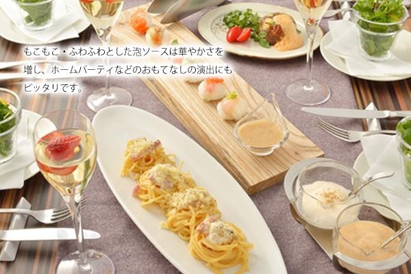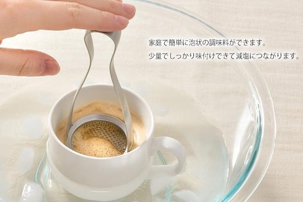 | 家庭で簡単に、必要な分だけカップの中で泡状の調味料を作ることができます。少量でしっかり味付けできるので減塩につながります。基本の泡から応用の泡まで作れる12レシピ付き♪ |