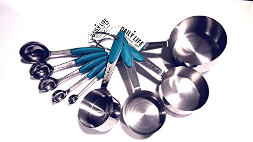 DLS - Measuring Cups & Spoons, Set of 9 - Premium Quality - Stainless Steel - Sturdy Build, Lightweight, Rust Proof - Engraved Measurements, Food Grade Silicone Grip - Can be Nested and Stacked (Teal)