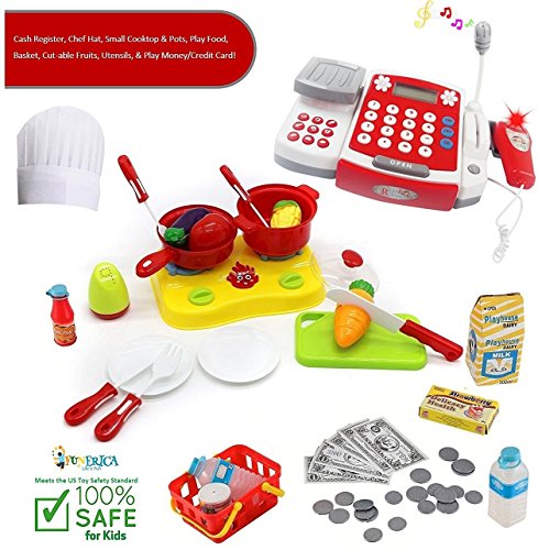 ✔ A DELICIOUSLY COMPLETE SET - This cashier toy set includes a Cash Register, a Shopping Basket, Play Money, a Mini Play Stove, Play Cookware, variety of Play Food & Cutting Veggies to slice, and a Chef Hat!