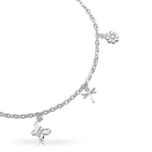 Add a little sparkle and glam to your ankle just in time for the warmer days ahead, when you wear a new sterling silver ankle bracelet. You favorite summer sandals will really stand out with a sparkling beautiful anklet around your ankle. You can wear this alone or pair it with other animal jewelry or sterling silver butterfly jewelry, for a chic and unique look. A delightful combination of three butterflies, two dragonflies and two daisies adorn our sterling silver dragonfly anklet. All seven charms are evenly interspersed along a rolo chain. Featuring a spring ring clasp and a one inch extender, our flower anklet will easily accommodate women with a variety of ankle sizes, making this a sensational gift for women of all ages on your gift list.Feature