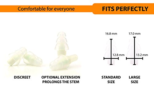 PERFECTLY FITS the ear canal and is made from a soft, non-toxic and hypoallergenic material. The set includes two silicone EXTENSIONS which are optional to use, in the case you would want to have a longer stem, enabling easier removal of the earplugs. You can choose from TWO SIZES: Standard and Large.