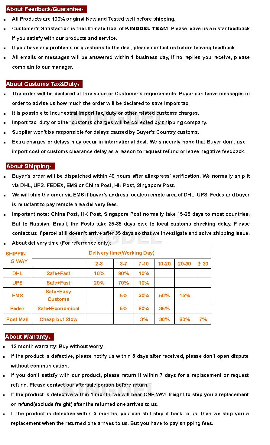 3、に応じてポリシー、それは買い手の支払う義務輸入税や付加価値税;それは通常宣言したでUSD100-120に節約買い手の税、しかし、わからない場合それは無料です。