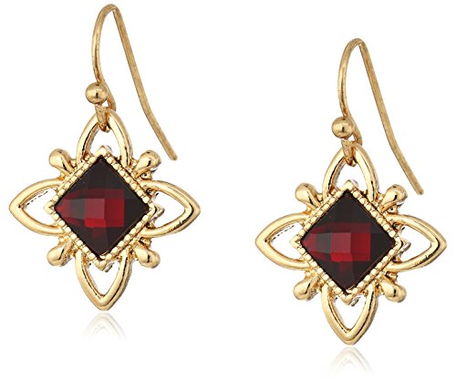 Gold tone drop earrings featuring diamond-shape red faceted stone accents