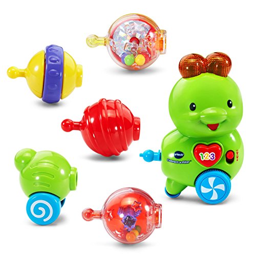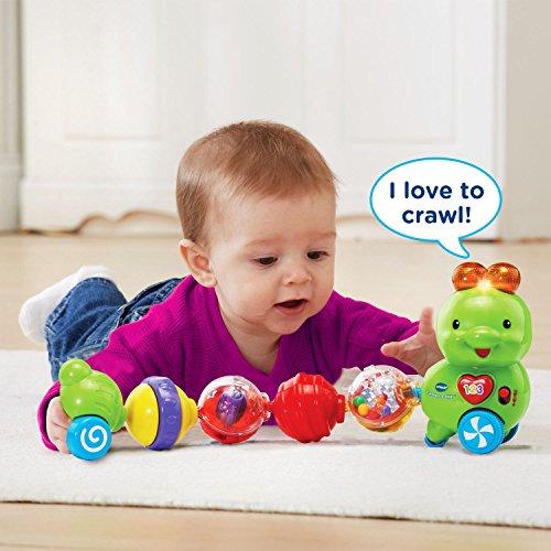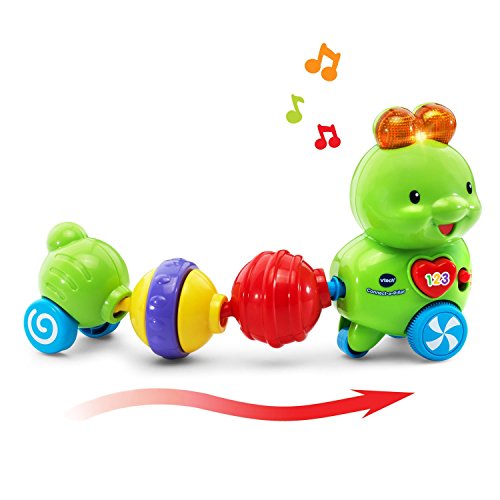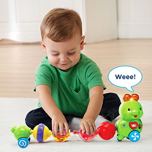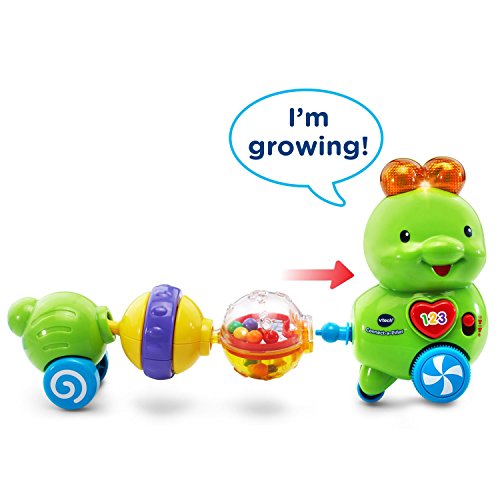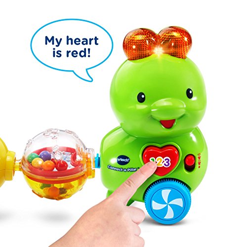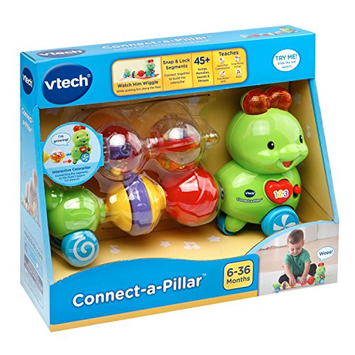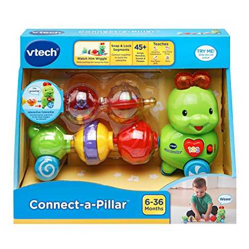 Snap the segments of the Connect-a-Pillar by VTech together to create an adorable, interactive caterpillar. Each segment provides sensory stimulation and encourages motor skill development as your little one plays with and connects each colorful ball. The four segments have fun interactive features that include rattling beads, a spinner, clicking sounds and tactile features. Press the heart button or connect a segment to the head to hear more than 50 fun phrases, songs and sounds. When pushed along the floor, the caterpillar wiggles and plays cute sounds and music to encourage crawling. 6 segments include a head, 4 interactive balls and tail. Connect the caterpillar and learn! Requires 1 AAA battery (battery included for demo purposes only; new battery recommended for regular use). Intended for ages 6 months to 3 years.Feature