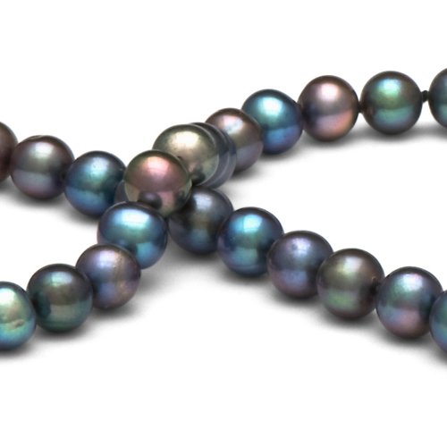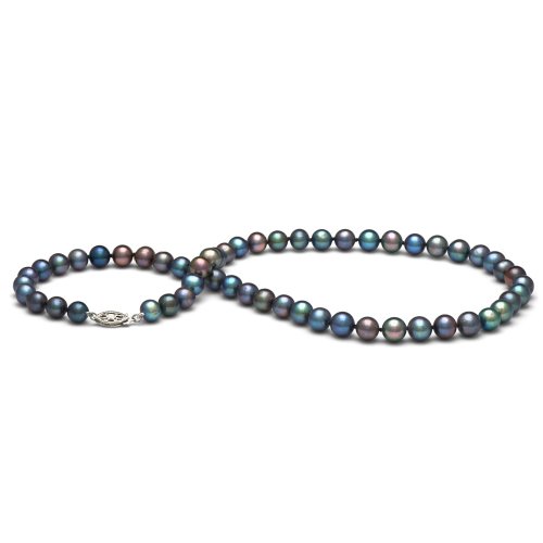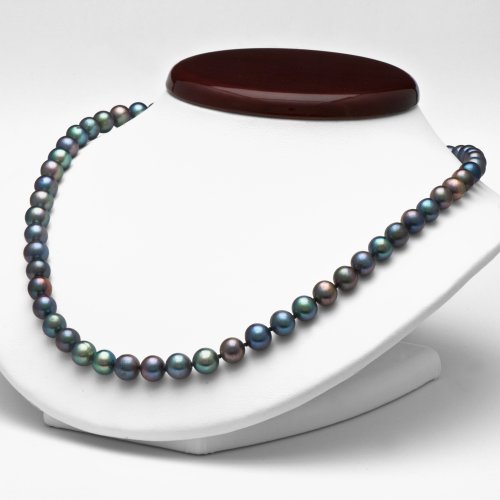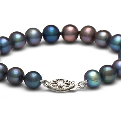 This stylish necklace is composed of very round to near round (AAA) 7.0-8.0 mm black freshwater cultured pearls. The gems are perfectly matched, have a smooth surface, and a color-treated body color featuring various dark hues and subtle overtones. Each strand is finished with a floral filigree fish hook clasp made of solid 14k white or yellow gold, which you can choose from. You can also select between lengths of 16 inches (pearl choker) and 18 inches (princess necklace).Feature