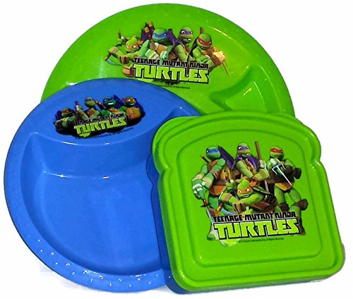 -. Feature : One Plate with 2 Compartments. One Bowl for Cereal or Soup. One Sandwich Box. 3 Pieces in All. / Marvel Teenage Mutant Ninja Turtles UNSQUISHABLE Sandwich Box with removable lid and Snack Container with Flip-Top Lid Great for Lunch Boxes or Road Trips. / Sectional Plate Measures 8" Across. Bowl is 7" across and 1.5" deep. / Dishwasher Safe in Top Rack. / MAKE EATING FUN WITH THE TEENAGE MUTANT NINJA TURTLES!