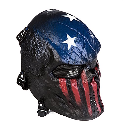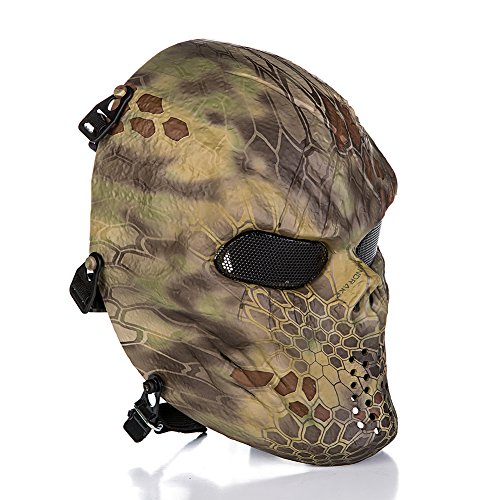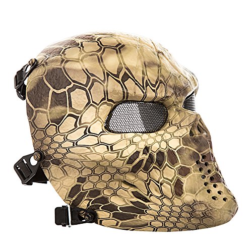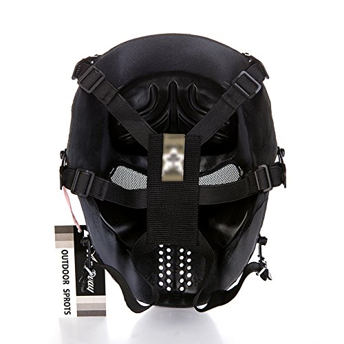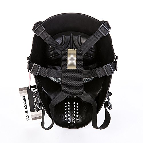 -. Feature : 100% eco-friendly synthetic resin material and adjustable elastic strap / Note: If this mask is used for Playing Paintball, have to wear a goggles together with this mask / Size: Full Face, One Size Fits Most Teens and Adults with adjustable strap,cushion padding inside for comfort wearing / Metal Mesh Eye Shield offer protection and no fog up in the game. Breathable and durable / This mask is lightweight and enough strong to protect your face and eyes when you play airsoft