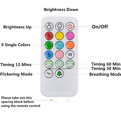 Pat & Remote Control: The remote control could work within about 7 meters, so you could lie in bed or sit on sofa to change modes & colors, set the time(15/30/60mins) and adjust the brightness; Additionally, you could also pat to switch among the 4 modes and enjoy the color changing