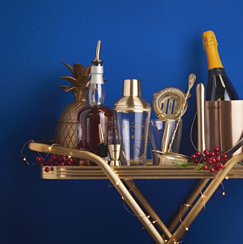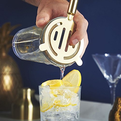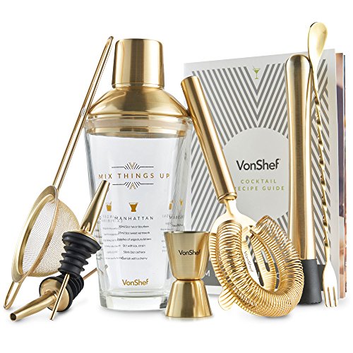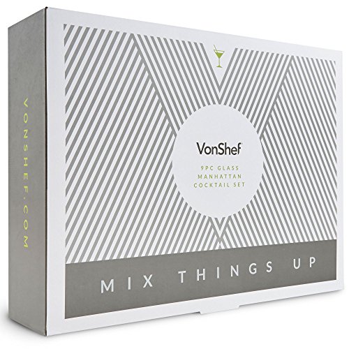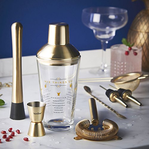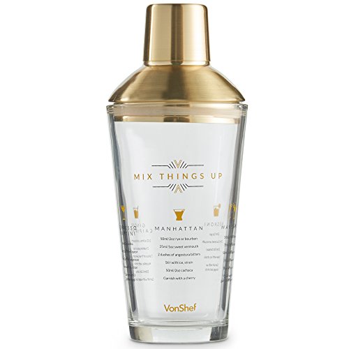 VonShef 9pc Glass Manhattan Cocktail Set Shake up gorgeous cocktails with the VonShef Glass Manhattan Cocktail Shaker Set. Host the cocktail party of the year and impress family and friends with super-delicious drinks. Elegantly designed 17oz capacity Manhattan cocktail shaker boasts a modern, sleek body and constructed from high quality clear glass with a stunning brushed gold stainless steel lid. Sturdy and durable, you can mix and shake to your heart's content. Must-Have Accessories The set includes everything you need to mix up impressive cocktails, including: Stainless Steel Muddler A must-have for crushing hard ingredients and unleashing and infusing flavours for uber-tasty cocktails. Stainless Steel Bar Spoon For stirring cocktails to enhance taste and texture. Features a twisted design so you can stir ice cubes in effortlessly. Stainless Steel Hawthorne Strainer No professional cocktail kit is complete without a Hawthorne Strainer. This sits on top of the cocktail shaker and strains away ice and other unwanted ingredients such as pips and large bits of fruit. Stainless Steel Julep Strainer Strain your cocktail concoctions directly over your glass with the julep strainer - ideal if you're straining muddled ingredients like fresh mint or lime. 0.5/ 1oz Shot Measuring Jigger Let's you recreate your recipe exactly - for a deliciously balanced cocktail. 2 X Stainless Steel Pourer Enjoy smooth free-flow pouring with the two included pourers - ideal for attaching to your favourite spirit bottles and preventing spills. Gift Box Recipe Guide Supplied in a stylish gift box with a matching recipe guide to get you started - this set is a great present for a loved one or as a treat to yourself. Accessories Measure: ?Manhattan Shaker: H9.4 X D3.5"; Capacity: 17oz Hand wash only. Not suitable for dishwasher. 0