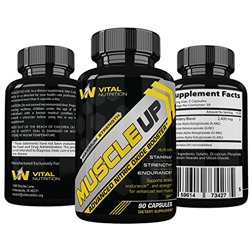 Why try out Vital Nutrition? • We take pride in offering the best quality products through our rigorous testing to make sure we perfect our blend so our customers can see peak results. Vital Nutrition is one of the fastest growing sports nutrition companies in the United States. Why? Because all of our products start with science and have a track record of providing results.What Happens When You Take a Nitric Oxide Supplement? • When you take a Nitric Oxide supplement like Muscle Up, you'll feel increased hardness in your muscles. This is due to increased blood flow to the areas that need it most because Nitric Oxide helps expand your blood vessels which also results in more oxygen reaching your muscles. The end result? A much stronger 'pump' that you wouldn't normally achieve. Some men report enhanced sexual performance as well, especially men over the age of 40, whose natural testosterone levels have begun to decline & require more energy.Product Details:•🔥 Safe, Natural Ingredients Great for the Heart & Muscle Building•🔥 Increases Stamina, Energy and Strength •🔥 Helps Improve Blood Flow for a Bigger Pump and Better Workout Performance•🔥 Extremely Effective Pre and Intra Workout •🔥 Servings per Container: 30 (90 Caplets) •🔥 Manufactured in an FDA Registered Facility •🔥 100% Money Back GuaranteedClick 'Add to Cart' above to get the most powerful Nitric Oxide Booster - Muscle Up by Vital Nutrition!Feature
