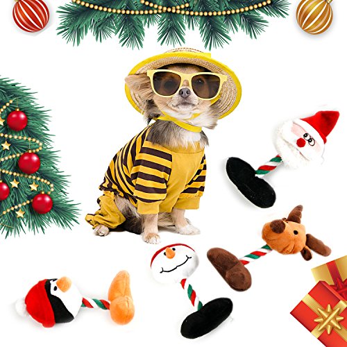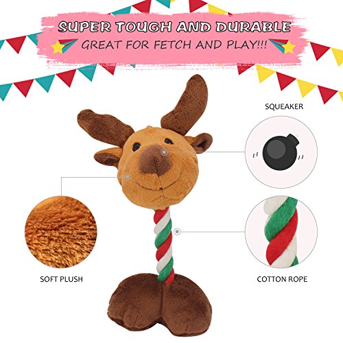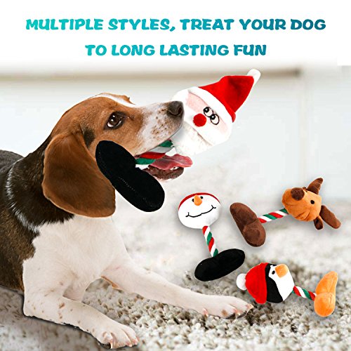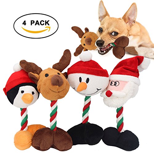 4 Pack Toys set - Value pack of durable, high quality toys. Four cute character toys are sure to keep pups playing. The Penguin, the Reindeer, the Santa Claus, the Snowman - the super fun sqeauky plush dog toy set.