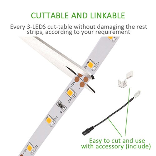 CUTTABLE AND LINKABLE: Easy to cut and use with accessory (include). It can be cut every 3 LEDs along the cutting marks, without damaging the rest strips.