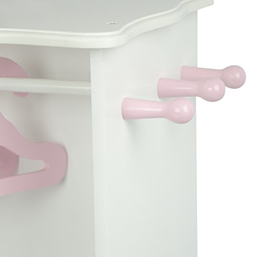 Accommodates dolls up to 18" tall, including American Girl® dolls^This spacious piece features hangers for her dresses, while shelving makes room for shoes and folded sweaters^Complete with a mirror so dolly can check her look, a makeup shelf for accessories, and additional hooks for towels or robes^Packaged with detailed step-by-step assembly instructions