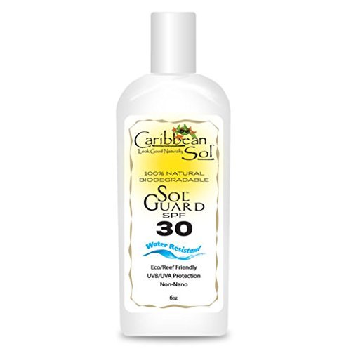 Caribbean Sol - Sol Guard Natural Sunscreen 6 oz. SPF 30 is a marine reef friendly, biodegradable, non-toxic blend of natural organic skin conditioning ingredients and natural sunscreens with 16% Zinc Oxide to provide Broad Spectrum Protection. The natural ingredients, including Cucumber extracts; Organic Aloe Leaf and Kukui Oil assist the skin's ability to hydrate and cool itself. Added are tropical plant extracts that are natural photo-receptors that assist screening UV rays. Wild Pansy; Hibiscus and Green Coffee Bean not only are skin conditioners, but act as natural preservatives, as well. No nano-technology is used in the processing of the natural minerals, Titanium Dioxide and Zinc Oxide.Feature