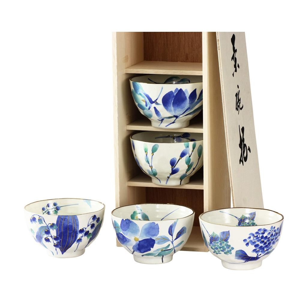 花水木、紫陽花、ネコヤナギ、スズラン、木蓮の五花を蒼で描きました。飯碗5客を木箱に入れたセットです。