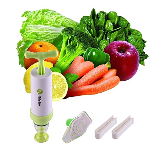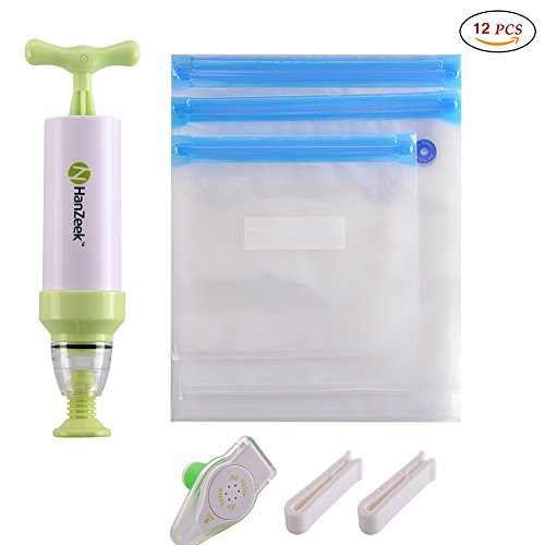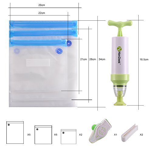 - REUSEABLE Food Storage Bags & Vacuum Hand Pump: Pump is small enough to easily store and reuse again. Reinforced double zipper ensures an airtight seal, Retard oxidation & growth of bacteria, and keep your food fresh 5 times longer than other traditional storage methods. Thicker multi-ply material,sealing bag can be reusable up to 10 times.