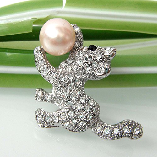 -. Title : Navachi 18k White Gold Plated Clear Crystal Pearl Cat Brooch Pin