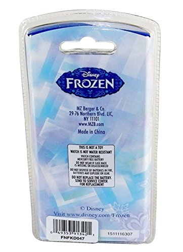 Your child will be delighted to receive this official Disney wristwatch to wear and show off to their friends. It has beautiful face cover featuring the characters Elsa, Anna & Olaf, the snowman from the hit movie "Frozen". Kids can learn to keep time with the easy to read LCD digital display screen, and they'll enjoy listening to a clip from the song "Let It Go" when a special button is pressed. The watch band is made from a sturdy plastic, sized for a child's wrist, and fastens with a plastic buckle. Operates on 3 "LR41" button cell batteries, which are included and already pre-installed.Feature