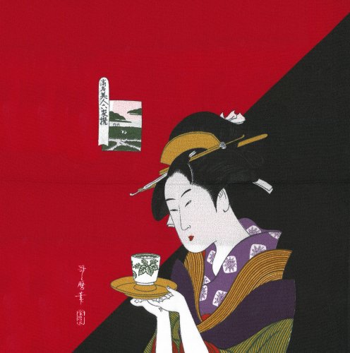 -. Title : 和雑貨 ちりめん 浮世絵風呂敷 中巾 45×45cm お茶美人 赤/黒 2060