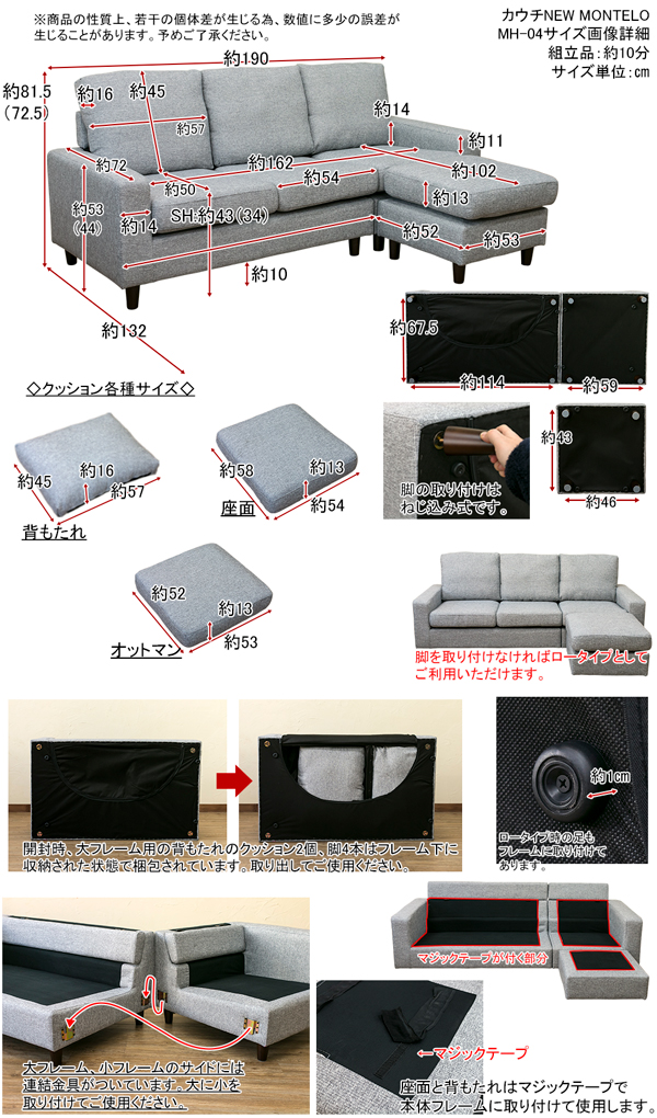 本商品はお取り寄せ商品のため、稀にご注文入れ違い等により欠品・遅延となる場合がございます。誠に恐れ入りますが、何卒ご了承ください。 また、以下の場合には追加送料がかかる場合がございます。  ・大型商品の複数購入時 ・同梱区分が異なる商品の複数購入時  【出荷目安】:1 - 4営業日 ※土日・祝除く 【同梱区分】:TS 1490 【梱包サイズ】:大型商品 【代引き決済】:不可  配送伝票の依頼主は出荷元(メーカーもしくは仕入元)名となる場合がございますので、お受け取りの際はご注意ください。   【型番】mh04  【商品名の色やサイズについて】 こちらは「カウチソファー/ローソファー 【左右入れ替え自由】 グリーン 肘付き 『NEW MONTELO』 張地:ファブリック生地」の商品ページです。商品画像や商品情報には、色違いやサイズ違いの商品が載っている場合がございます。ご注文前に色・サイズ・セット内容のご確認をお願いいたします。  ◆ご注意◆ 大フレーム用のクッションと脚は裏面に収納されています ファスナーを開けて取り出して下さい カウチ NEW MONTELOです  カウチは左右入れ替え自由です どちらのレイアウトでもご使用いただけます また、スツールとしてもご使用できます  張り材は、肌触りの良いファブリック(布)を使用しています。  脚は取り外しができるので、外すだけでロースタイルにも ネジを回すだけで簡単に脱着できます  ブラック(BK)、ブラウン(BR)、グリーン(GN)、グレー(GR)、オレンジ(OR)の5色展開です  幅1900×奥行1320×高さ815(725)mm(梱包サイズ:幅1250×奥行765×高さ500mm・幅700×奥行750×高さ500mm) 本体重量:45.0kg(梱包重量:32.4kg・17.8kg) 組立式(約10分/脚の取付けと背もたれのセッティング、本体とクッションの設置)2個口 構造部材:木製フレーム 張り材:ファブリック 中材:ウレタンフォーム、Sバンド、ポケットコイル 脚:天然木(ラッカー塗装)  原産国:中国  【ご注意事項】 ※本商品は、北海道・沖縄・離島への配送はいたしかねます。あらかじめご了承ください。