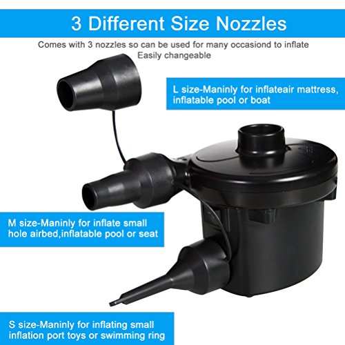- 3 NOZZLES - This electric pump comes with a 3 interconnecting nozzles so you can inflate almost every inflatable product. Really easy to use due to its simple mechanism.