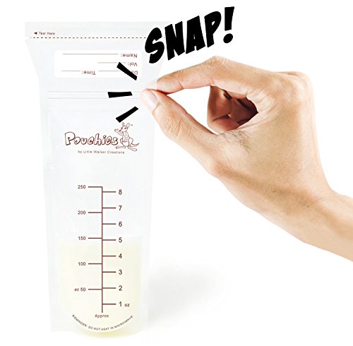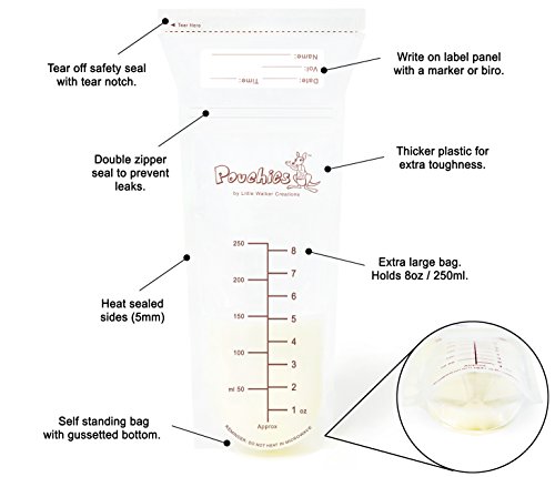 -. Feature : BONUS Breastfeeding ebook: The Complete Guide - Everything A New Mother Needs To Know About Breastfeeding. This is our free gift to you to when you purchase our Pouchies Breastmilk Storage Bags. / BPA free and pre-sterilized ready to use. The tamper evident tear off safety seal ensures that each bag is contaminant free. Thick durable plastic, 5mm heat sealed sides, and a 'SNAP' double zipper all ensure that our bags are leak proof, and your precious breastmilk is protected. / Largest bag available, can store 8oz/250mls allowing you to store a little or store a lot. The larger bag allows for flatter storage saving space in the fridge or freezer, and provides faster thawing. / Self standing bag with a reinforced base to prevent spills and make it easier when pouring your breastmilk into the bag. The uniquely designed funnel shaped top also helps prevents spills when pouring milk into and out of the bag. / Panel to record Date, Time, Volume and Name for easy fridge or freezer organization. You can write smudge free with a biro or marker pen.