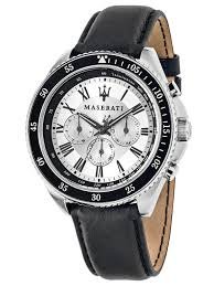Maserati Stile man's watch with a very modern and sporty style thanks to its chronograph and tachometer functions and toothed bezel. The Maserati Stile watch can be used daily and it's going to be be right in your special occasions, too.This watch is made of stainless steel and blue leather strap. It has a dial with white and blue tones and a water resistance of 100 meters.Feature
