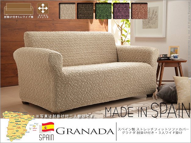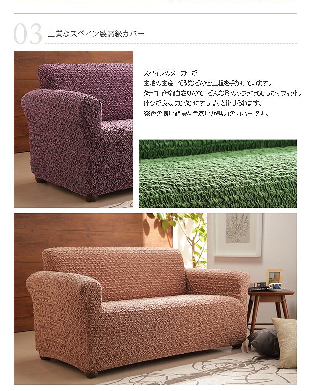 ●商品について:スペイン製の生地を使用したストレッチ素材のソファカバー。シンプルな無地ながら質感の良い生地でソファに座るのが楽しくなりそう。