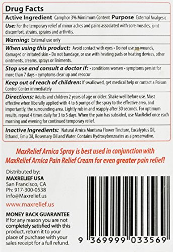 -. Title : MaxRelief Australia's #1 Pain Relief Spray now made in the USA - Arnica, Eucalyptus & Oil - 4 Fl Oz - 3X times more Arnica than other Pain Sprays [Chosen by Sufferers of Back, Neck & Muscle Pain - Reduces Arthritis Pain and Joint Inflammation]