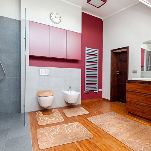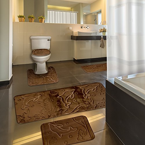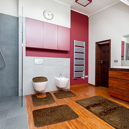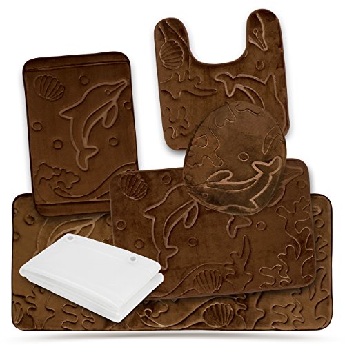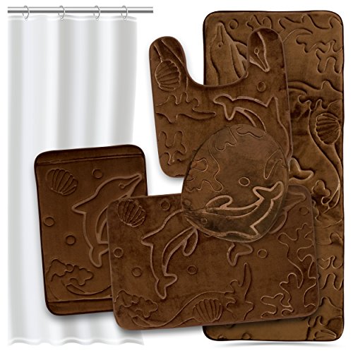 Bathroom Rugs Set 5 Piece Memory Foam Mats + Eva Shower Liner, Extra Soft Anti-Slip Shower Large Bath Rugs – Happy Feet, Happy Life, Brown