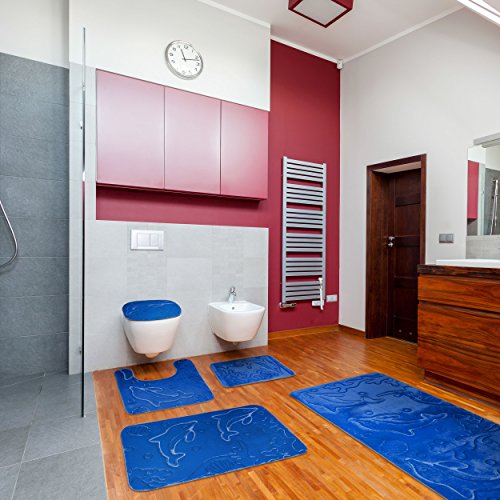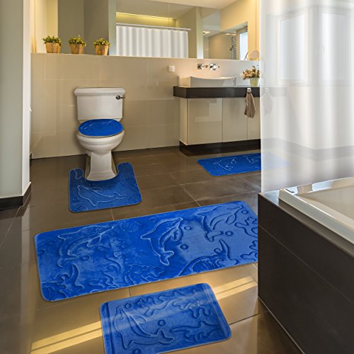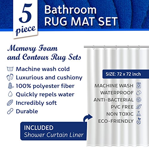 Bathroom Rugs Set 5 Piece Memory Foam Mats + Eva Shower Liner, Extra Soft Anti-Slip Shower Large Bath Rugs – Happy Feet, Happy Life, Royal Blue