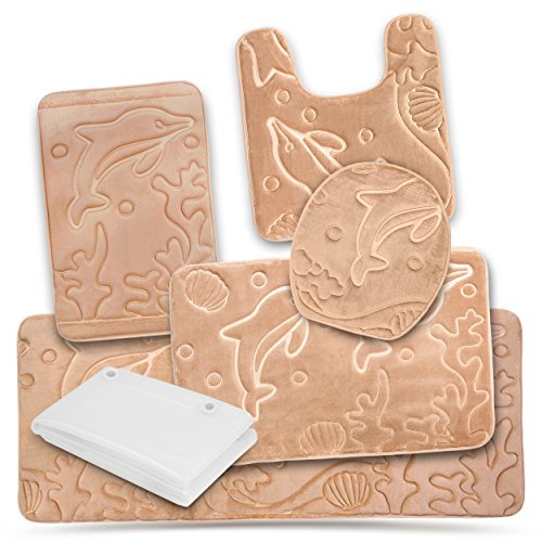 Bathroom Rugs Set 5 Piece Memory Foam Mats + Eva Shower Liner, Extra Soft Anti-Slip Shower Large Bath Rugs – Happy Feet, Happy Life, Beige