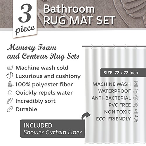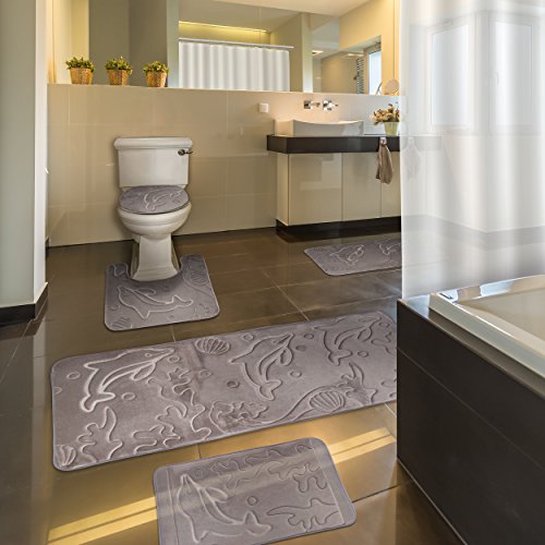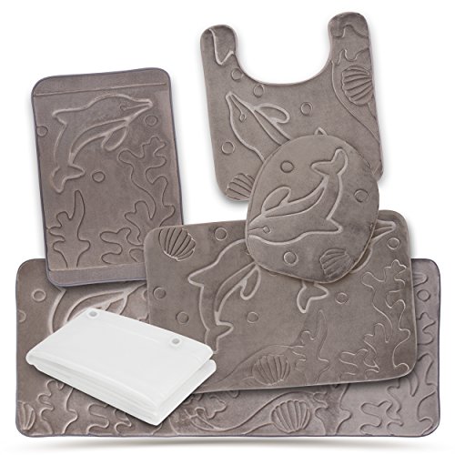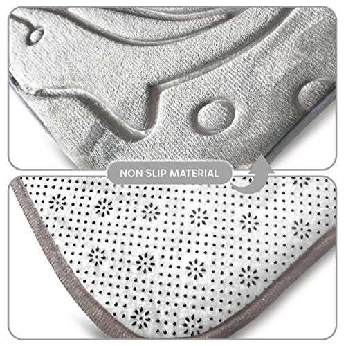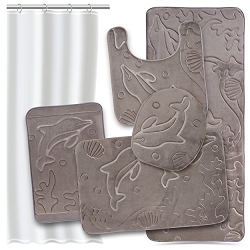 Bathroom Rug Set 5 Piece Memory Foam Mats + Eva Shower Liner, Extra Soft Anti-Slip Large Bath Rugs – Happy Feet, Happy Life, Grey