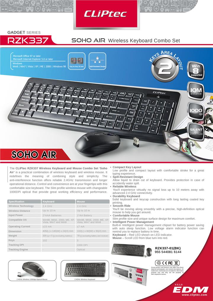 The CLiPtec RZK337 Wireless Keyboard and Mouse Combo Set 'Soho-Air' is a practical combination of wireless keyboard and wireless mouse. It redefines the meaning of combining style and simplicity. The anti-interference function offers reliable 2.4GHz transmission and longer operational distance. Control and convenience are at your fingertips with this comfortable size keyboard. The Slim profile wireless mouse with changeable 1000DPI optical that provide great working efficiency and performance.