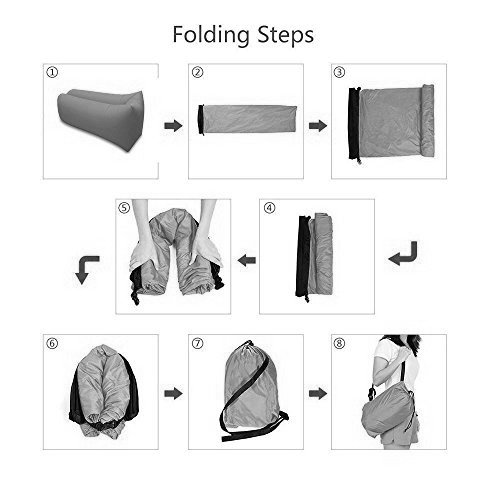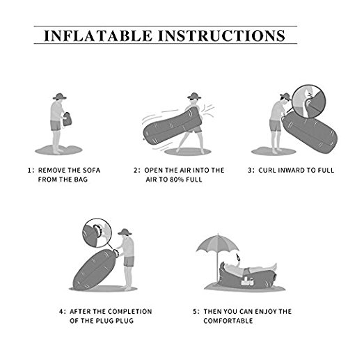 How to Use: Step 1: Take inflatable lounger out from storage bag Step 2: Open air intake and run against wind until the lounger is nearly full Step 3: Inward roll the air intake Step 4: Bend and buckle the opening Step 5: Enjoy your time with inflatable lounger
