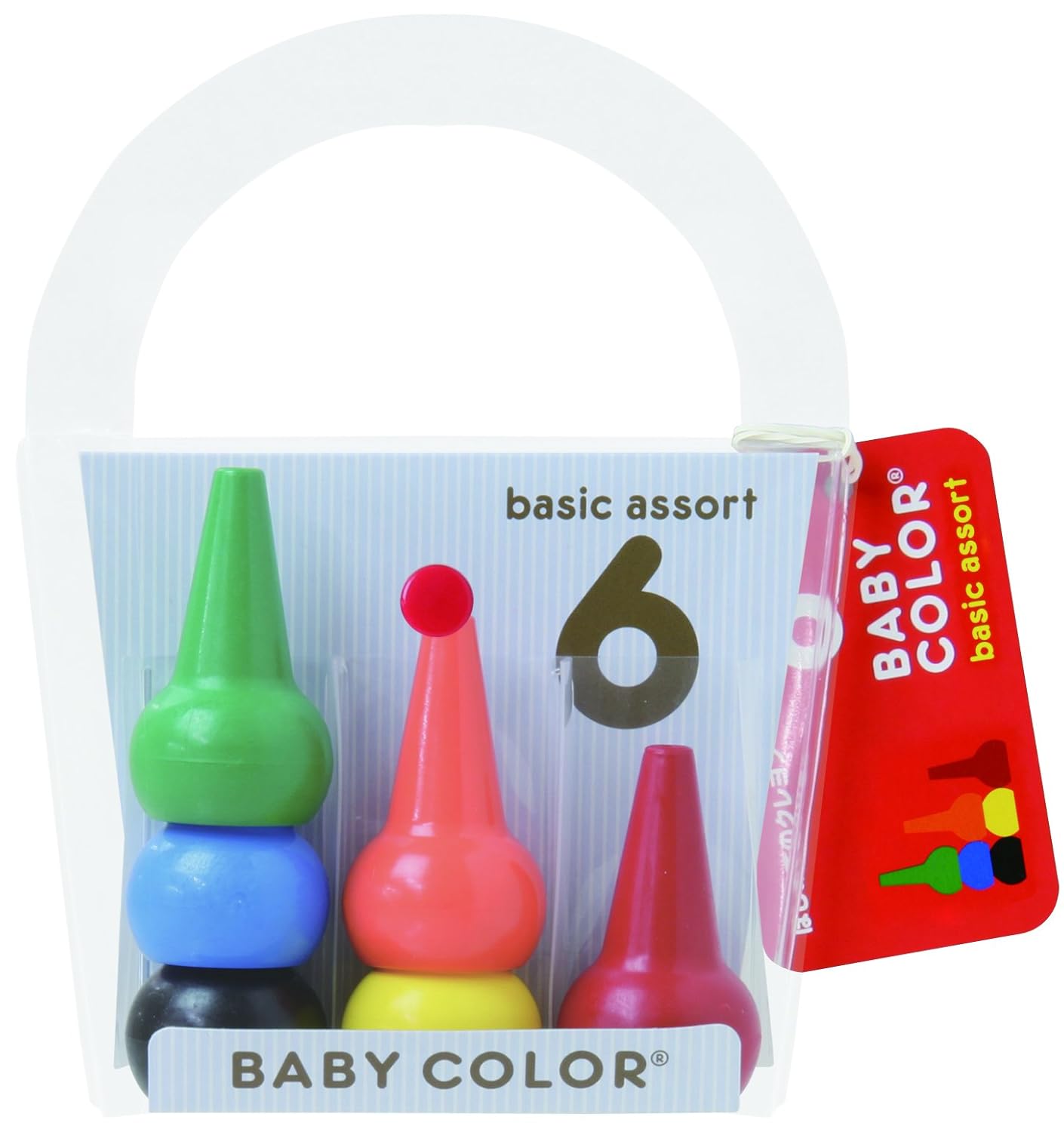 ペンが持てない年齢から使えるクレヨンです。永年の研究から開発された独特の形と、折れにくく、汚れにくい形が特長のクレヨンです。なめても安全な素材を使用。信頼のAPマークを取得しています。衣服についても洗濯で落とせます。クレヨン自体も水洗いできます。中は空洞で先端にも穴がありますので、積み重ね遊びもできますし、万一飲み込んでも空気が通ります。ケースは少し大き目サイズ作ってあり、おかたずけの練習も楽しくできます。基本色の6色セットです。