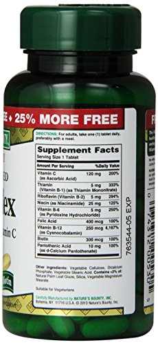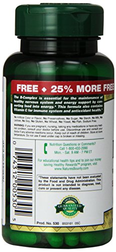-. Binding : Health and Beauty -. Brand : Nature's Bounty -. EAN : 0074312005305 -. Feature : Supports heart and nervous sytem health.* / Folic acid supports the health of pregnant women.* / Supports energy metabolism.* / Healps maintain immune system health.* / *These statements have not been evaluated by the Food and Drug Administration. This product is not intended to diagnose, treat, cure or prevent any disease. / Timed-release formula delivers B vitamins plus Vitamin C / For immune system and antioxidant health / Coated tablet for easy swallowing / B-Complex is essential for the maintenance of healthy nervous tissue / B vitamins play a role in energy metabolism in the body -. Label : Nature's Bounty -. Manufacturer : Nature's Bounty -. MPN : 270546 -. NumberOfItems : 3 -. PackageQuantity : 3 -. PartNumber : 270546 -. ProductGroup : Health and Beauty -. ProductTypeName : HEALTH_PERSONAL_CARE -. Publisher : Nature's Bounty -. SKU : 316695(3) -. Studio : Nature's Bounty -. Title : Nature's Bounty B Complex Vitamins Plus Vitamin C, Time Released, 125 Tablets (Pack of 3) -. UPC : 074312005305
