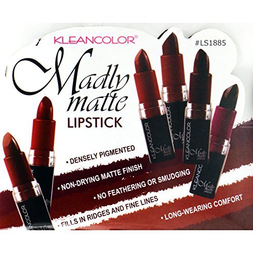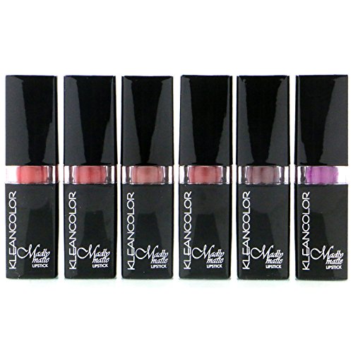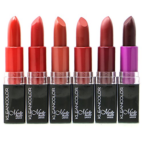 Kleancolor madly matte lipstick. This set comes with 6 different color: sienna, antique ruby, cafe noir, rosewood, aubergine, fandango. Net wt. 0.12 oz. each standard size. This lipstick with cap approximately 2 7/8 inches in height. Densely pigmented. Non-drying matte finish. No feathering or smudging. Fills in ridges and fine lines. Long-wearing comfort.Feature