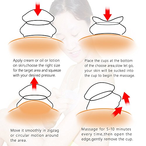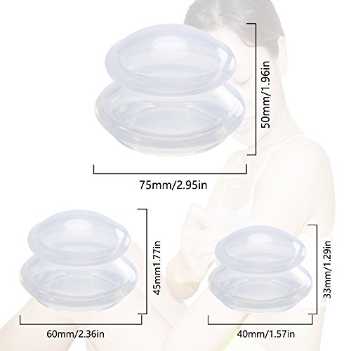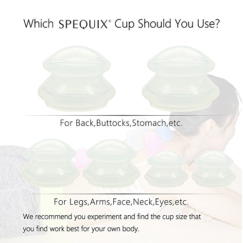 Studio : TANDAO Publisher : TANDAO Binding : Health and Beauty Product Description SPEQUIX Body Cup - Basic Use ? Use shower gel, oil or any other light lubricant on the area to be massaged in order to reduce friction ? Squeeze your Massage Cup in the middle ? Press the cup's mouth to your skin and release, gentle drawing the skin into the cup ? Using both hands, move the cup smoothly in straight-lines, circles, and zig-zags. ? Massage for 5-10 minutes every time you shower for results inside 4 weeks! SPEQUIX Facial Cup - Basic Use ? Apply cleanser or cream or nourishing oil to the face ? Massage the face and neck - start at the chin and use strokes back along the jaw to the ear. ? Follow with more strokes from the ear along the sinuses to the nose. ? Now the forehead, upward stokes starting between the eyebrows, followed by outward strokes moving towards and along the hair-line, before dropping all the way down to the neck to the collar bone. ? Tone the skin afterwards ? Use 2-3 times a week for best results Package: 6 Pieces Silicone cups Dia 2.95 in*H 1.96 in, 2PCS Dia 2.36 in*H 1.77 in, 2PCS Dia 1.57 in*H 1.29 in, 2PCS