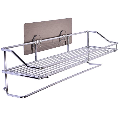 Crystallove Self Adhesive Chromed Metal Shower Caddy Storage Basket Bathroom Wall Mounted Corner Shelf Kitchen Spice Holder Organizer with Towel Bar (Style 1)