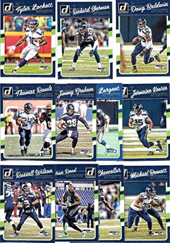 Seattle Seahawks 2016 Donruss NFL Football factory sealed 14 card team set including Steve Largent, Russell Wilson, Thomas Rawls, Kam Chancellor, Doug Baldwin, Tyler Lockett, Jermaine Kearse, Jimmy Graham, Richard Sherman and Michael Bennett plus a rookie card of Jarran Reed and short printed Rated Rookies Alex Collins #351, C.J. Prosise #354 and Nick Vannett #388.