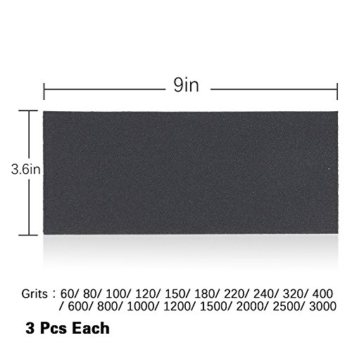 - √ Meet All You Need. Package includes 42 grit sandpapers, 3 sheets of each grit: 60/ 80/ 100/ 120/ 150/ 180/ 220/ 240/ 320/ 400/ 600/ 800/ 1000/ 1200/ 1500/ 2000/ 2500/ 3000.