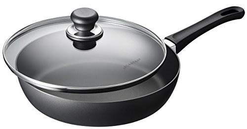 Scanpan 11" Titanium Classic Saute Pan w/LidDesigned &manufactured in Denmark, Scanpan's pressure cast aluminum cookware features a patented PFOA-free Ceramic Titanium Nonstick surface for easy release, fat-free cooking and easy clean up. It even allowsfor use of metal utensils. Experience perfect heat distribution and heat retention with Scanpan, the only premium nonstick cookware that can sear, brown and deglaze food. Suitable for all stovetops, except induction. Features:* Capacity: 3¼qt* All glass lids used for the SCANPAN Classic Ceramic Titanium series are made in tempered glass and are ovenproof to 260ºC.* The best stick-resistant cookware you can buy! To make Scanpan Titanium, the Danish manufacturer fires titanium ceramic into a pressure cast aluminum base, the thickest of any cookware on the market. The result is avirtually indestructible cooking surface in a panwith even heat distribution that is guaranteed not to warp under any circumstances. Feel free to use metal utensils and scouring pads.* The cookware and its see-through Pyrex glass lids are oven-proof up to 500F. The extra thick bases are ruler-flat, so the pans conduct heat evenly even on ceramic or hologen ranges. And the lifetime warranty means that the company stands by its workmanship. Ifyou have a problem with one of these pans, send it back to Scanpan and they will replace it.* Scanpan Titanium is not like T-Fal and other "slippery" non-sticks. Its cooking surface is composed ofmillions of microscopic "hills and valleys". It works best when you wipe on a drop or two of oil before each use. Cleanup? Just immerse the hot pan into cold water. It steams itself clean.Feature